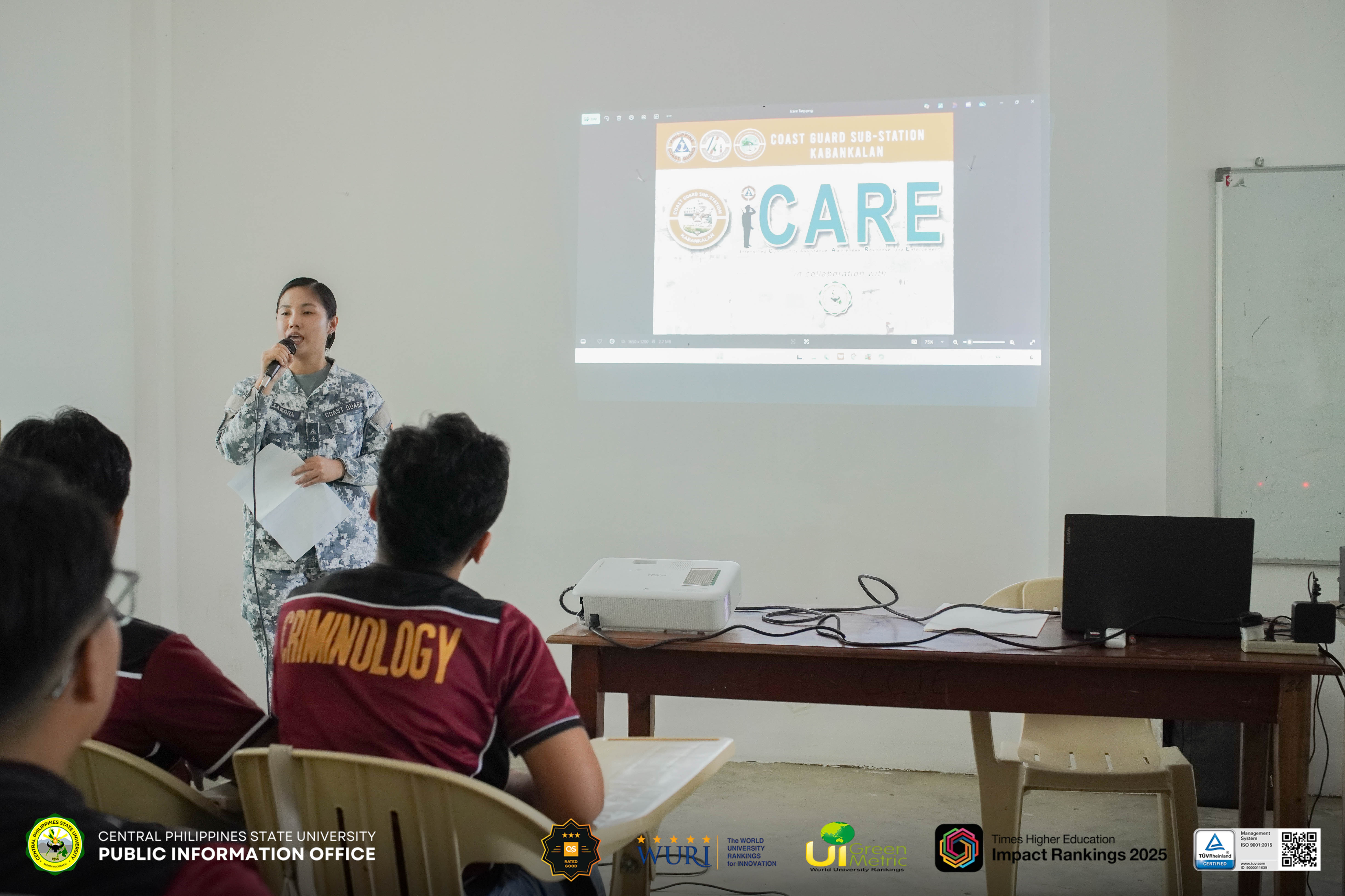 The Philippine Coast Guard (PCG) and Central Philippines State University (CPSU) - College of Criminal Justice Education (CCJE) successfully held the Intensified Community Assistance, Awareness Response and Enforcement (iCARE) Program to strengthen awareness of safety, discipline, and environmental protection.